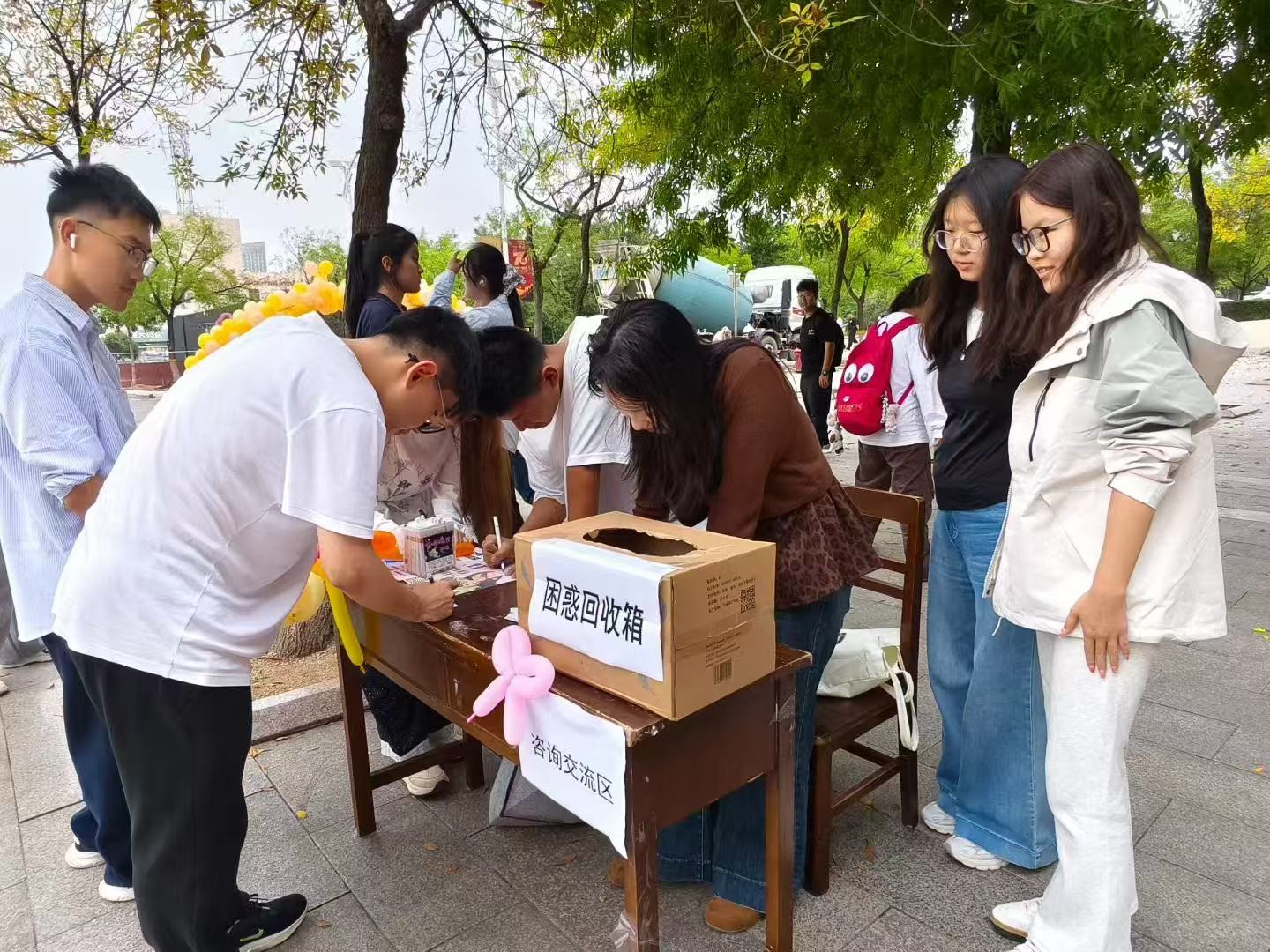 “气球解忧行动”以沉浸式体验为核心,让心理支持更具仪式感与互动感。同学们先写下学业压力、人际困扰等内心困惑,凭参与券自主挑选承载着积极语句的彩色气球——每一颗气球都像一个“解忧胶囊”,包裹着贴合学生需求的安慰与指引。在安全区域内,大家或亲手踩爆气球,不仅释放了积压的负面情绪,更从取出的卡片中收获鼓励、建议,实现“服务零距离”。