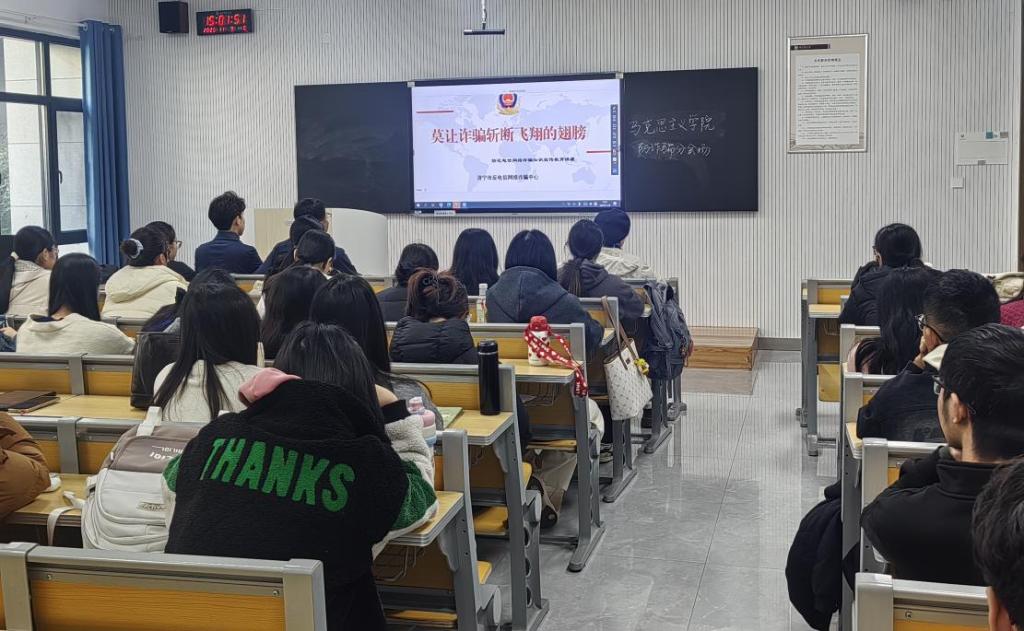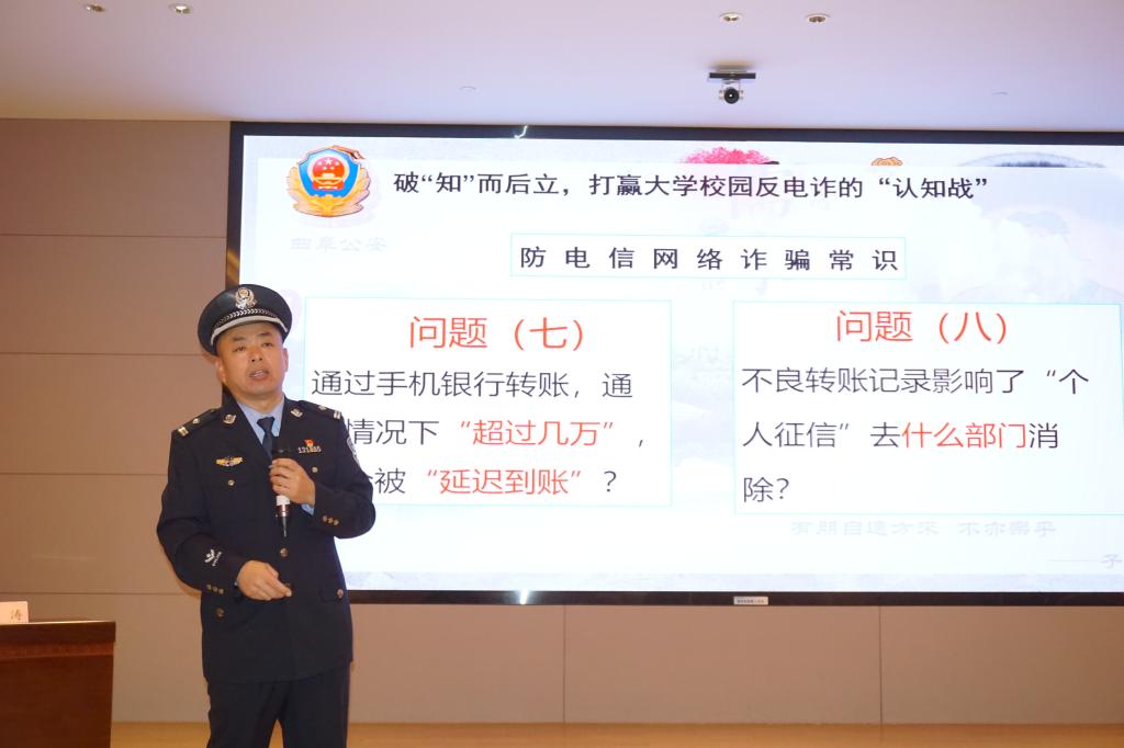 11月9日,曲阜师大保卫处、学生工作处联合组织开展防范电信诈骗宣讲活动,特邀济宁市反诈中心宣传讲师、市反诈协会专职秘书长陈延龙,曲阜市公安局警官孔涛来校做防范电信诈骗宣传。